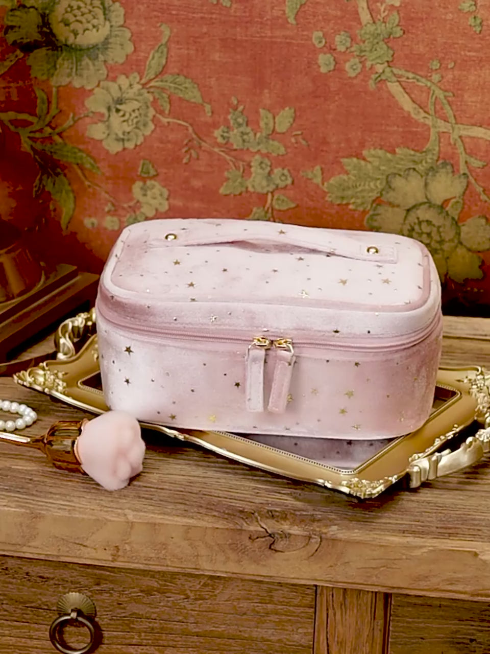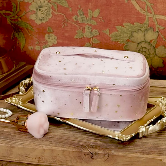 A dreamy velvet pouch sprinkled with stars, ideal for carrying your favorite jewelry and beauty must-have